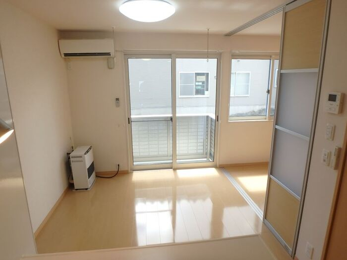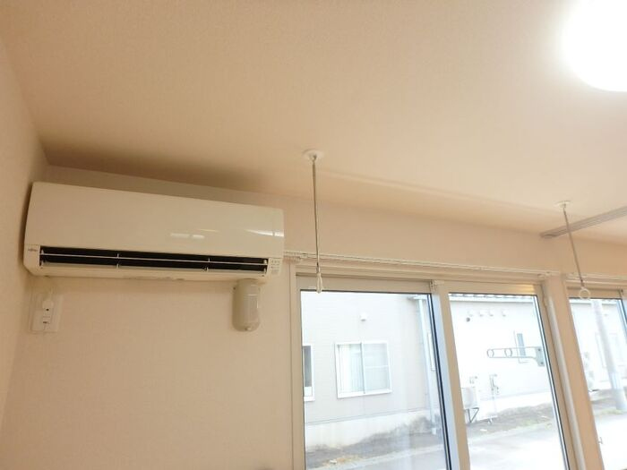 駐輪場(バイク可)、クローゼット、カメラ付インターホン、下足箱、給湯、エアコン、灯油FF、照明器具、室内洗濯機置場、洗髪洗面化粧台、シャワー付トイレ、シャワー、追焚バス、物置、バストイレ別、電話設置可、24時間セキュリティシステム対応、バルコニー、カウンターキッチン、BSアンテナ、LPG、インターネット使用料無料、複層ガラス